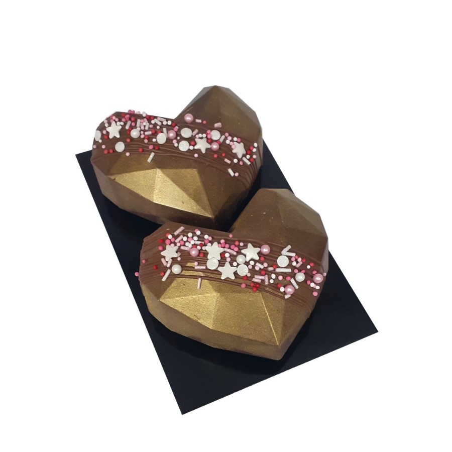 Capsa amb dos cors, el de color rosa és de cobertura de Xocolata blanca, pa de pessic de vainilla i melmelada i el de cobertura de Xocolata negra, pa de pessic de vainilla i Nutella.