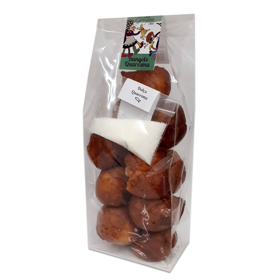 Cada bossa consta amb una bosseta de sucre per si els voleu ensucrats o no. Si els voleu ensucrats heu d'obrir la bosseta de sucre i tirar-la a la bossa amb els bunyols, tancar la bossa i sacsejar fins que el sucre quedi ben repartit.
