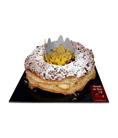 Este Roscón contiene dos sorpresas escondidas: un haba seca y una figurita de uno de los Reyes. Según la tradición, quien encuentra la figurita en su trozo es coronado con la corona dorada de cartón que decora el centro del pastel, mientras que quien se encuentra el haba es a quien le toca pagar el roscón.