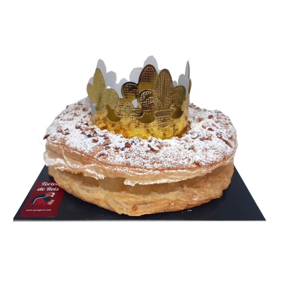 Este Roscón contiene dos sorpresas escondidas: un haba seca y una figurita de uno de los Reyes. Según la tradición, quien encuentra la figurita en su trozo es coronado con la corona dorada de cartón que decora el centro del pastel, mientras que quien se encuentra el haba es a quien le toca pagar el roscón.